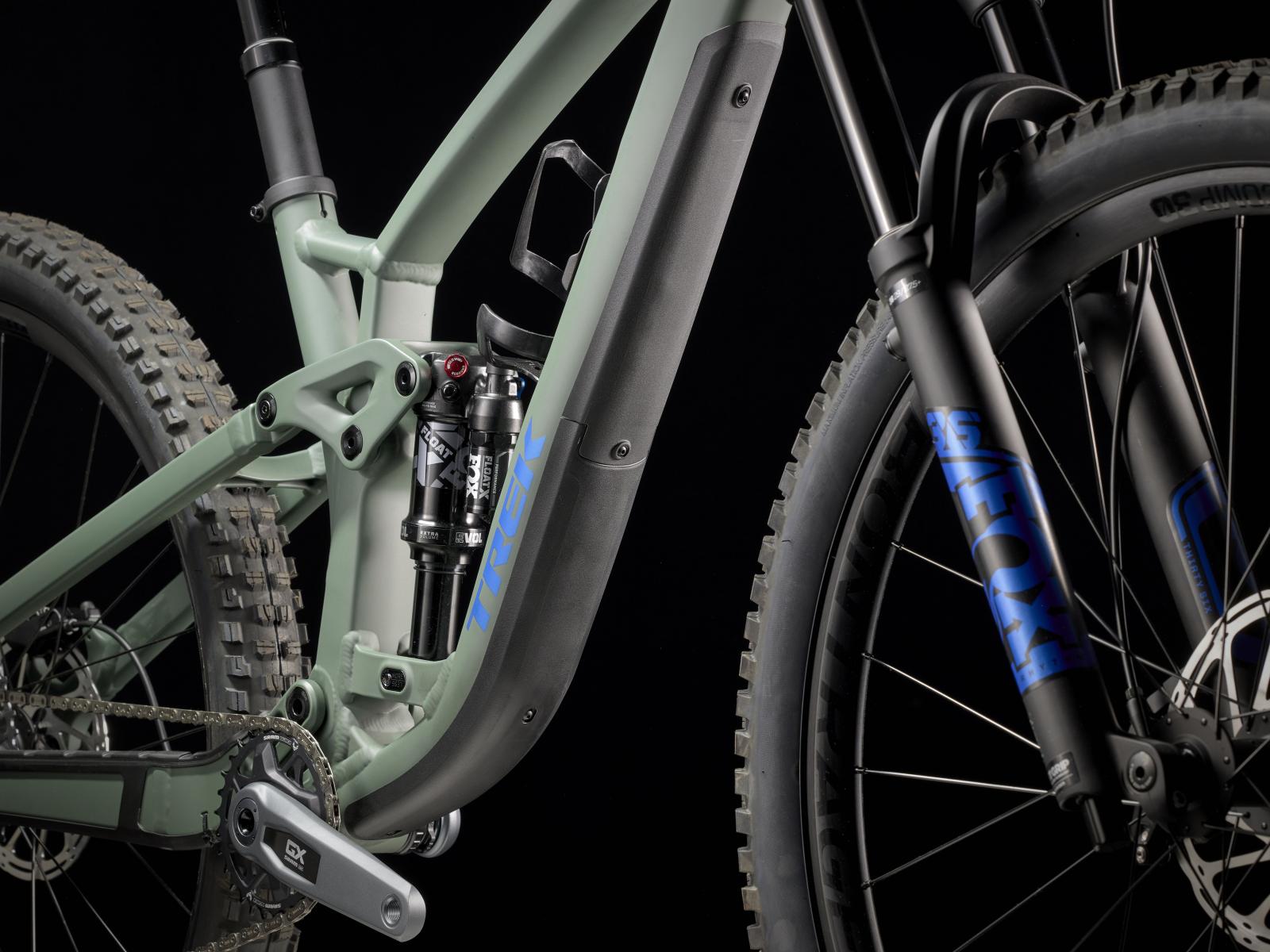 Einen leichten und steifen Aluminiumrahmen, eine FOX Rhythm-Gabel mit 150 mm Federweg, Float EVOL-Luftfeder und GRIP-Dämpfung für eine optimierte Performance bei kleineren Unebenheiten sowie einen FOX Performance Float X-Hinterbaudämpfer. Dazu bekommst du SRAMs neuartigen drahtlosen und präzise schaltenden GX Eagle AXS 12fach-Antrieb und zuverlässige Tubeless-Ready-Laufräder von Bontrager. Und dank der verstellbaren Geometrie hast du stets die volle Kontrolle über dein Setup.